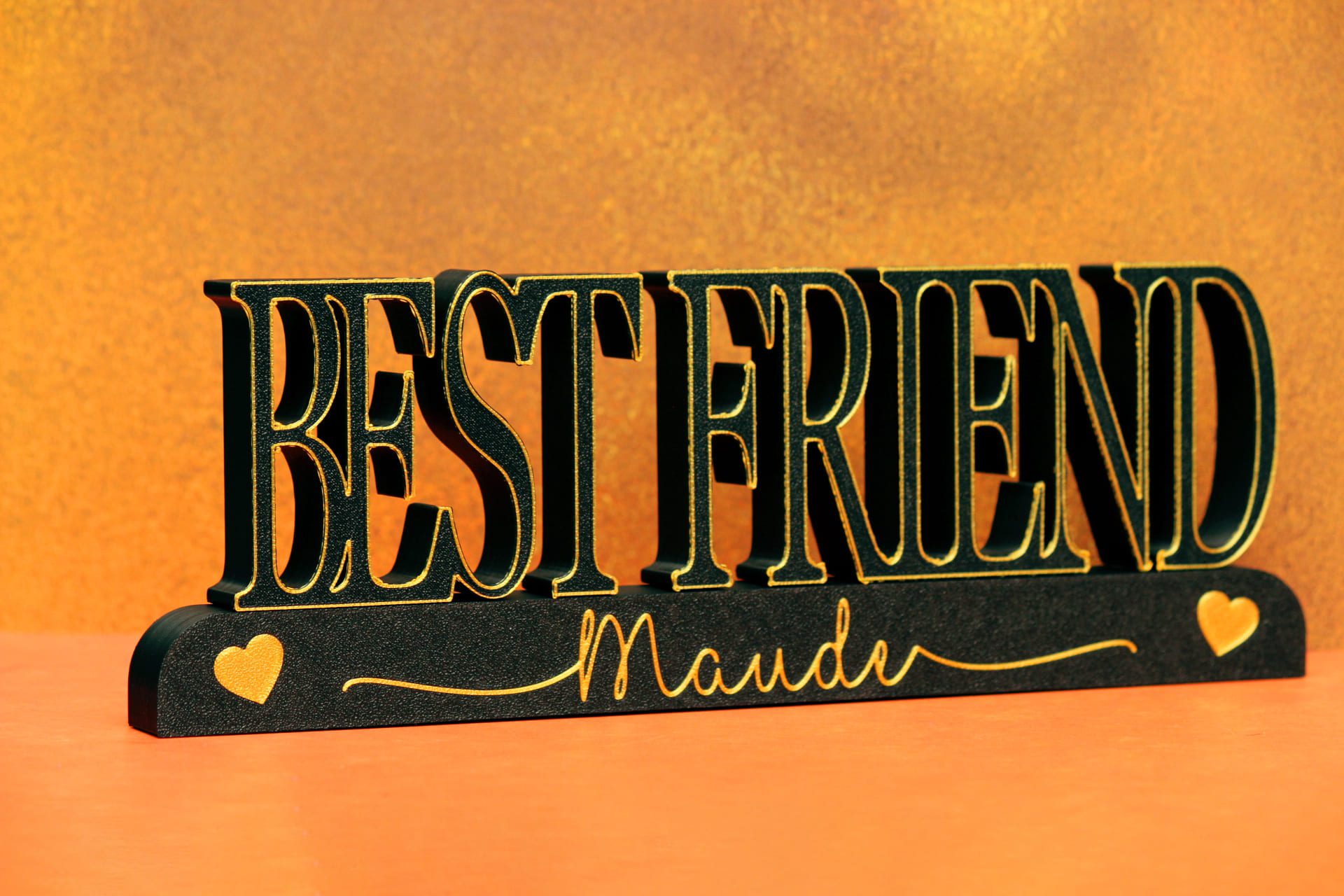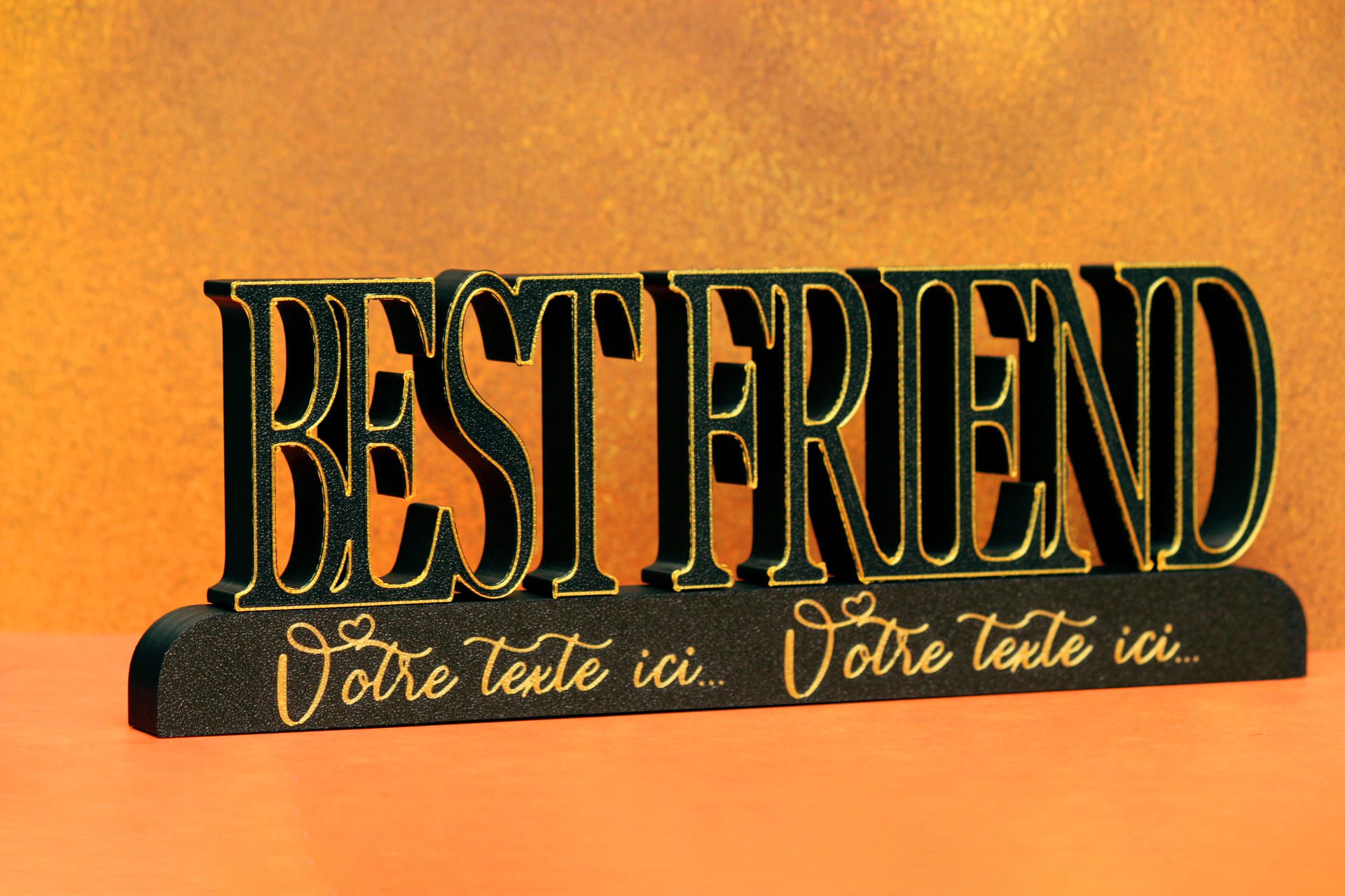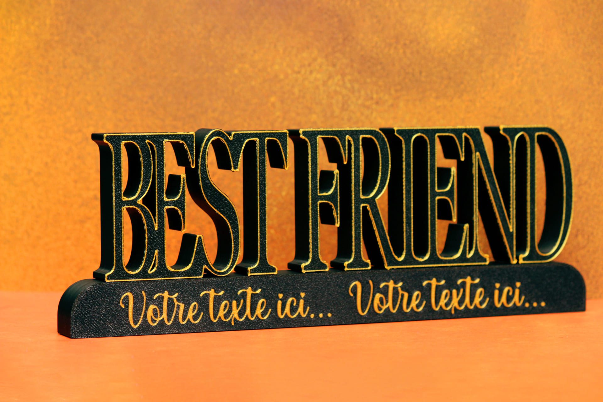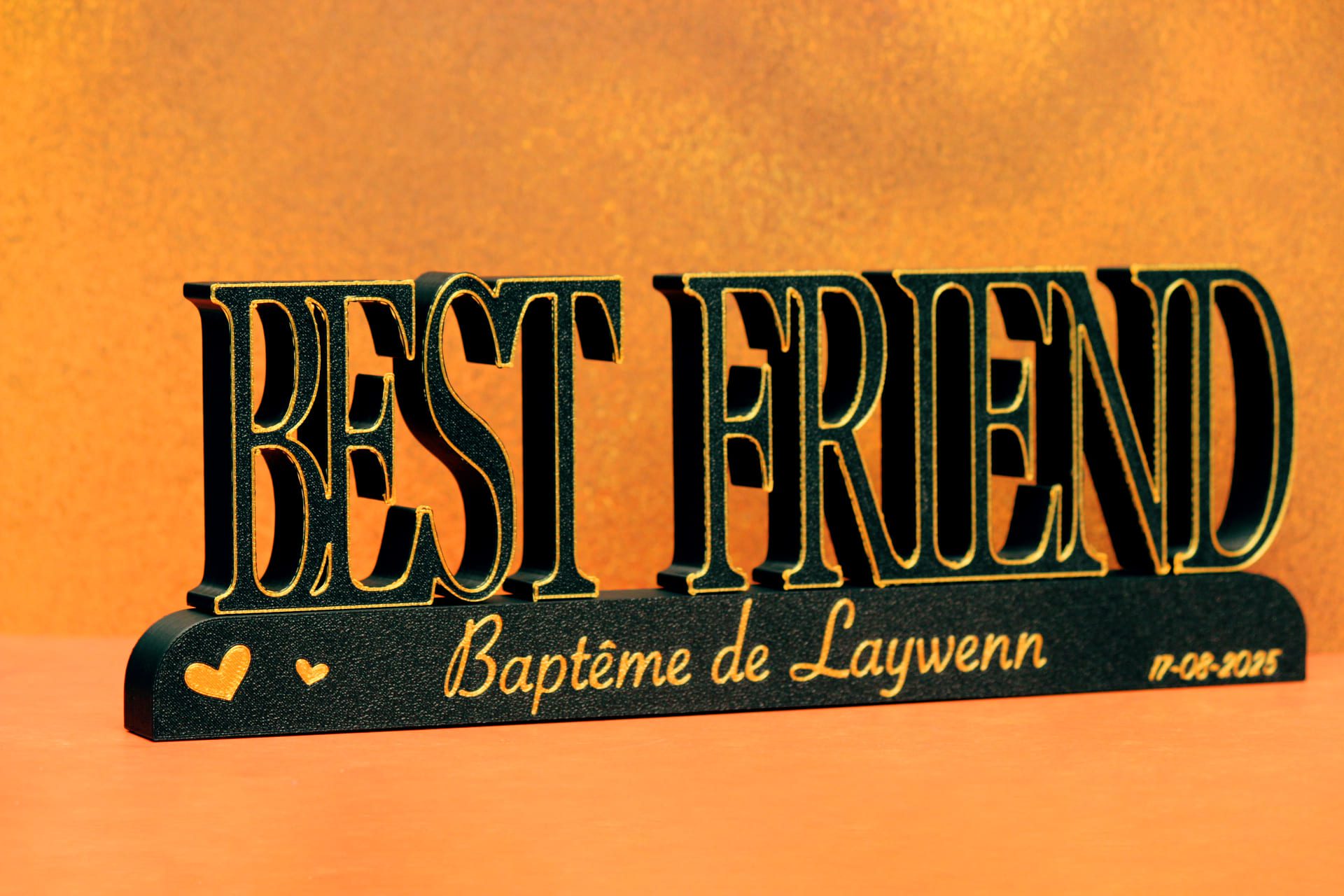 Imprimé en 3D dans notre atelier français, ce support met en valeur le mot “BEST FRIEND” avec les prénoms de votre duo, trio ou groupe d’ami(e)s.