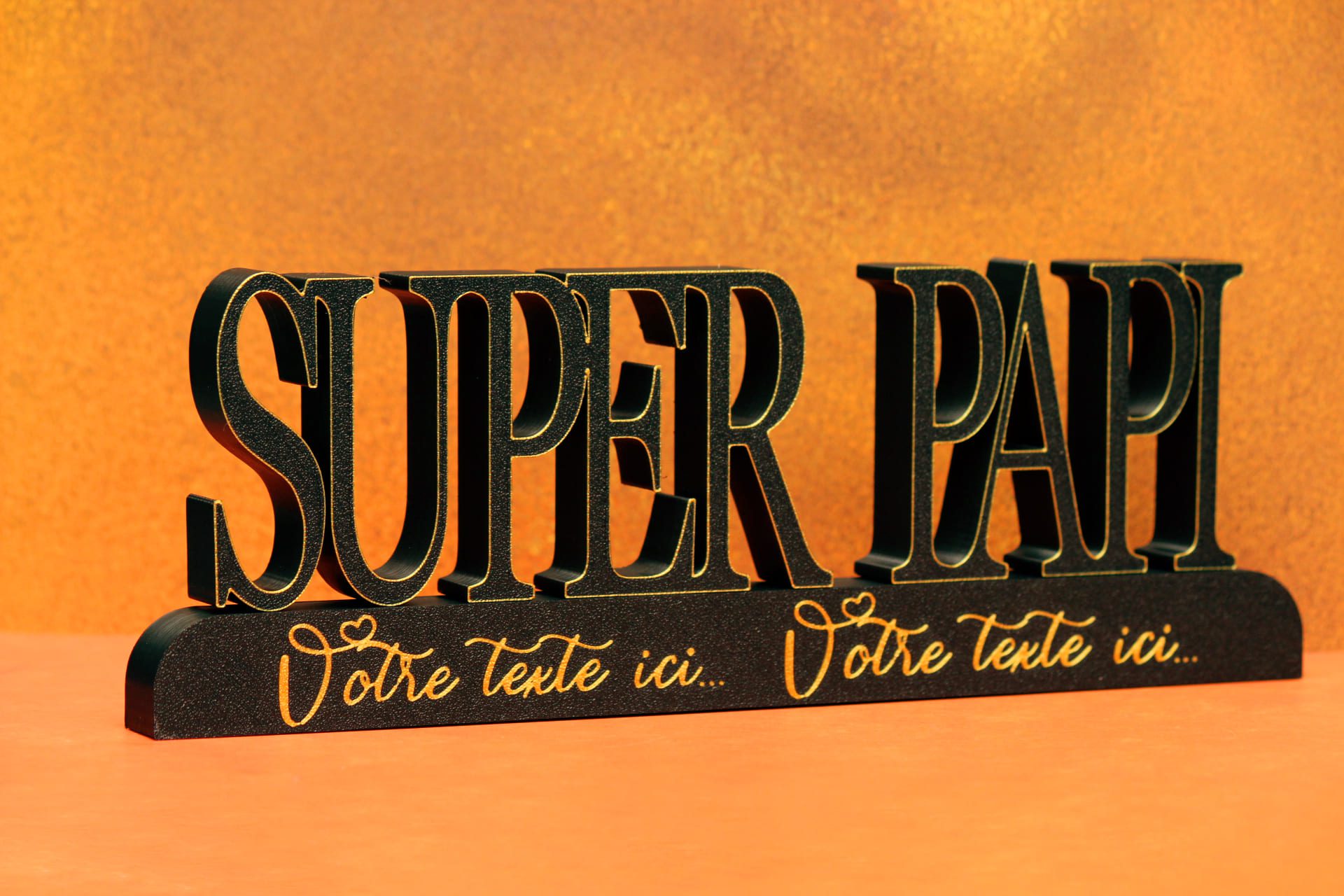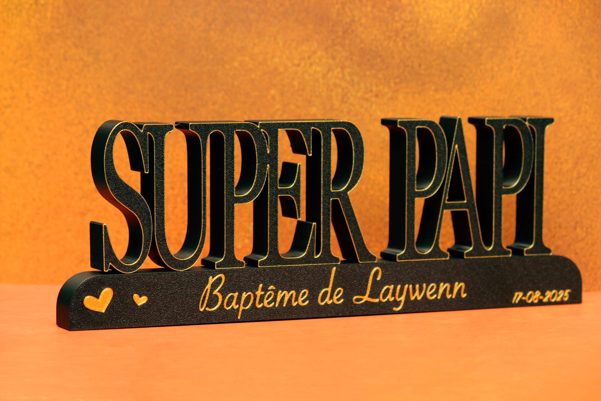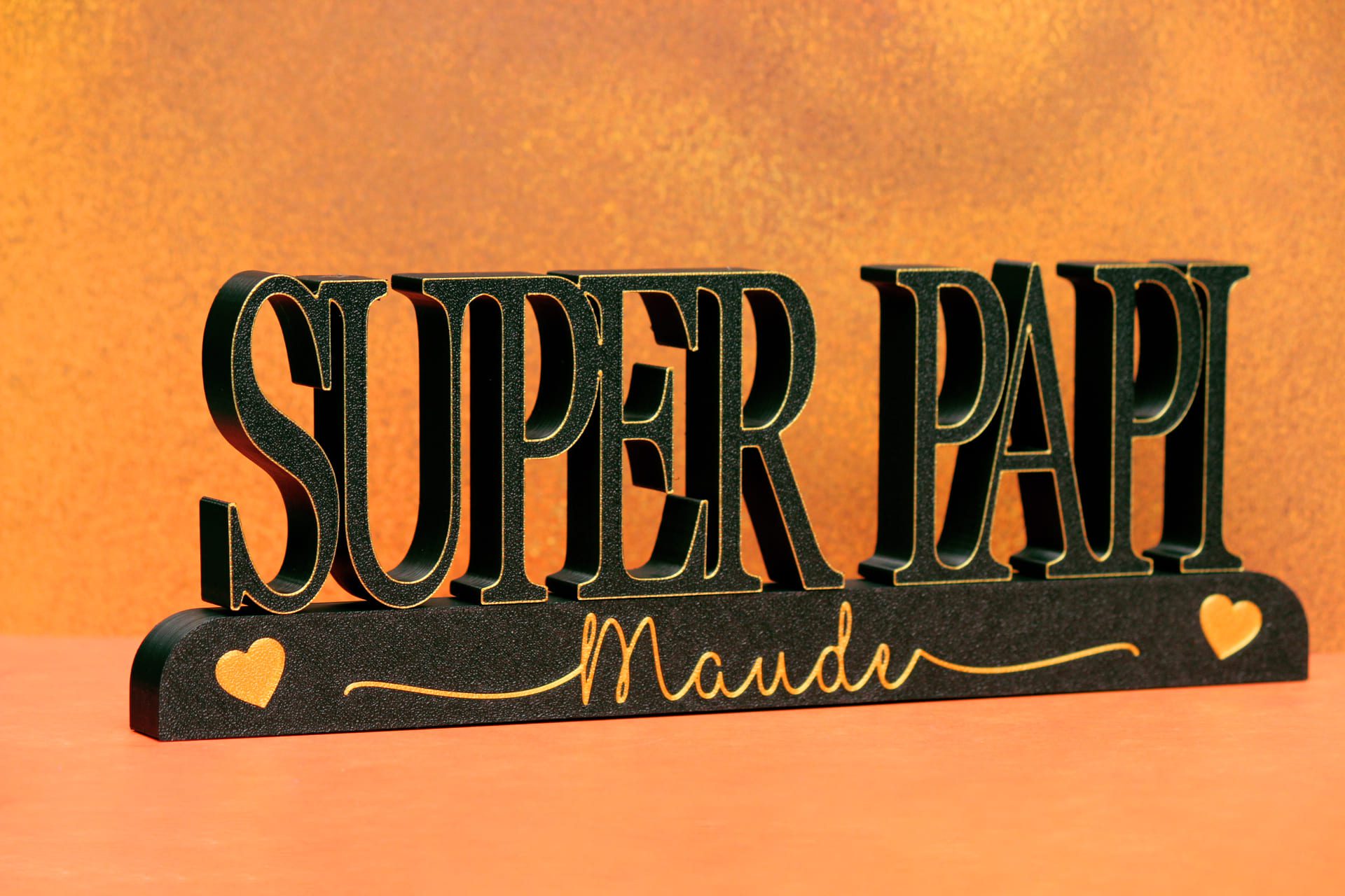 Conçu dans notre atelier français avec du PLA écoresponsable, ce support met en valeur le mot “SUPER PAPI” accompagné des prénoms de ses petits-enfants.